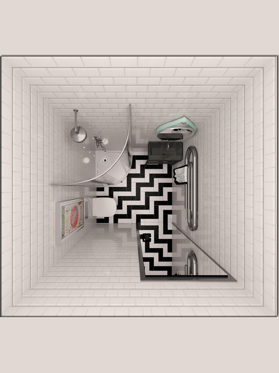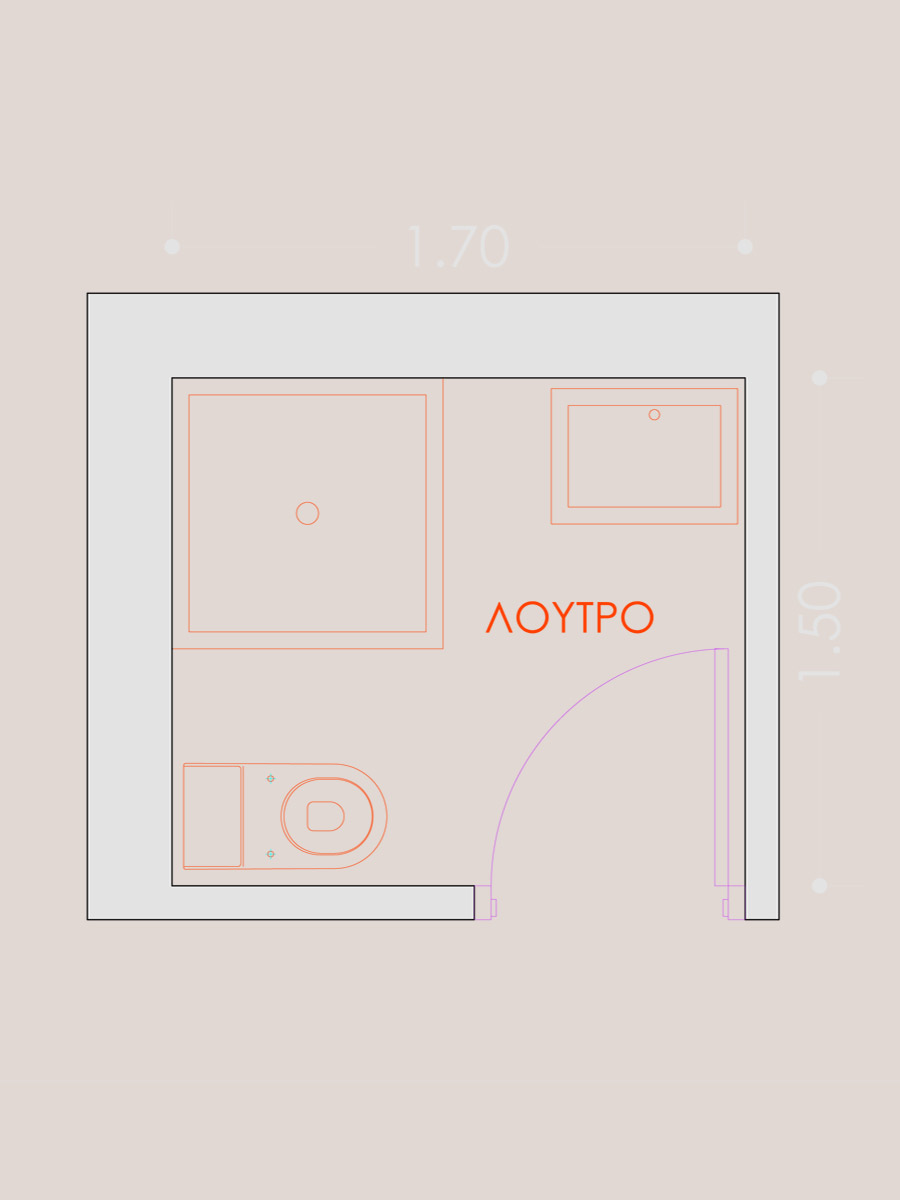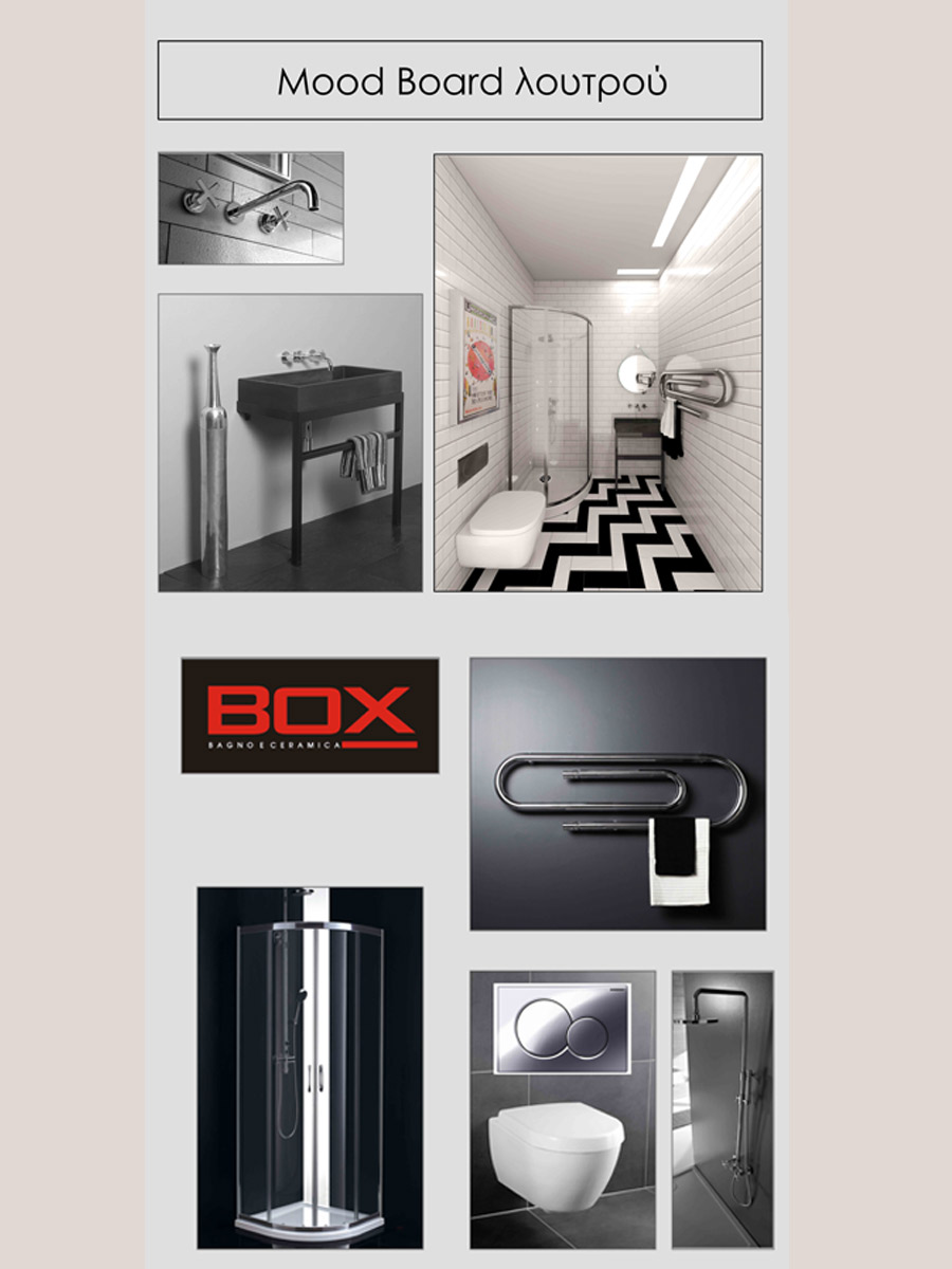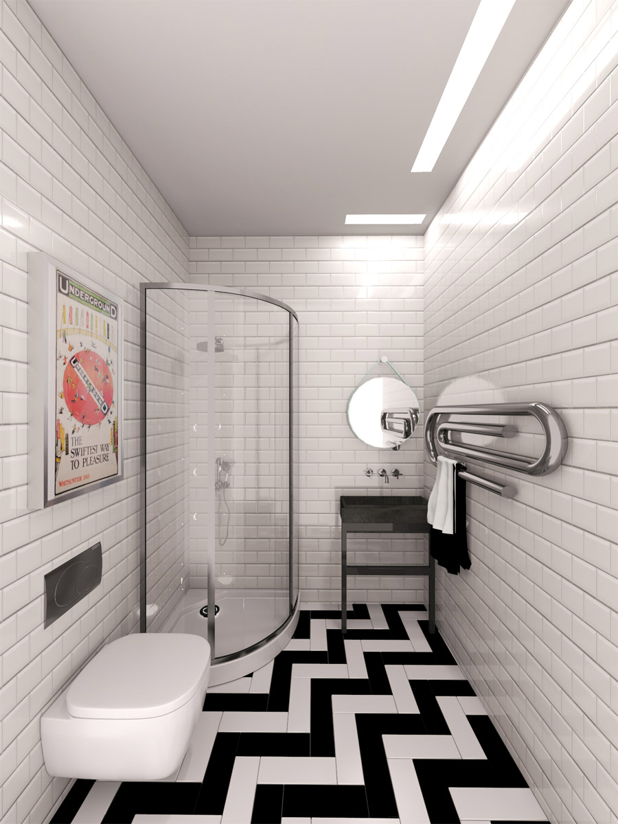 Σε αυτό το πρότζεκτ θέλουμε να ευθυγραμμίσουμε το design του wc με το στυλ του υπόλοιπου διαμερίσματος το οποίο είναι λιτό και γεωμετρικό, σύγχρονο και εκκεντρικό, με τον αέρα της μεγαλούπολης και του ταξιδιού στο εξωτερικό. Για αυτό το λόγο επιλέγουμε φωτιστικά οροφής και τα τοποθετούμε σε τέτοια διάταξη ώστε να θυμίζουν τα φώτα του μετρό, επιλέγουμε πλακάκι τύπου τουβλάκι που θυμίζει μεγαλουπόλεις της βόρειας Ευρώπης ή της Αμερικής, στο οποίο δίνουμε ένα twist πολυτέλειας με τη λάμψη και το μπιζουτάρισμα και επιλέγουμε διάταξη herringbone για τα πλακάκια του πατώματος για τον ίδιο λόγο. Ένα εξεζητημένο θερμαντικό σώμα σε μορφή μεταλλικού συνδετήρα κι ένας τολμηρός κρεμαστός καθρέφτης δίνουν ένταση στο χώρο. Η παραμικρή λεπτομέρεια, ακόμα και το κάδρο είναι επιλεγμένο στην ίδια λογική!